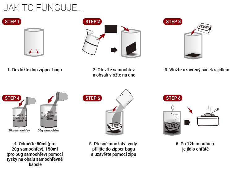 Samoohřev funguje na principu exotermické reakce mezi oxidem vápenatým a vodou. Náš samoohřevný systém se skládá z ohřevných kapslí (20 gramů na ohřev 600 nebo 300 gramů jídla, 50 gramů na ohřev 2x600 nebo 300 gramů jídla) a zipper bagu, ve kterém se celý ohřev odehrává. Zipper bag je možno používat opakovaně.
