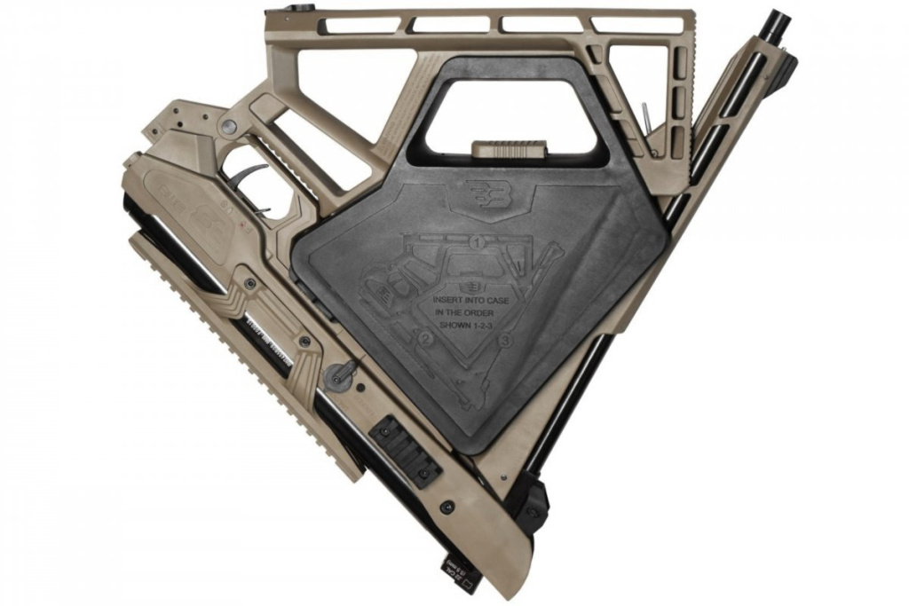 Skládací vzduchovka Black Bunker BM8 5,5 mm Coyote Tan s plynovým pístem a závitem pro tlumič, navržená pro přežití. Více informací